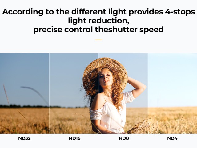 2. Der ND4-ND32-Neutraldichtefilter ermöglicht eine einstellbare Lichtreduzierung in 4 Stufen. Die Intensität des Neutraldichtefilters kann jederzeit je nach Bedarf eingestellt werden, um sich an unterschiedliche Lichtverhältnisse anzupassen.