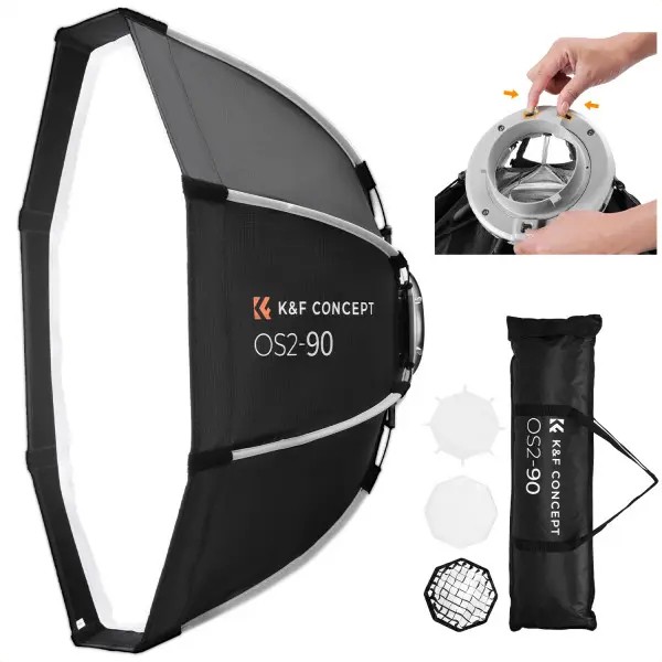 Die K&F CONCEPT 90 cm flache achteckige Softboxist ein schnell aufzubauender Lichtmodifikator mit Bowens-Halterung, der für eine weiche, gleichmäßige Ausleuchtung mit natürlichen runden Catchlights entwickelt wurde und sich somit ideal für Porträts, Modeaufnahmen, Interviews und Außenaufnahmen eignet.