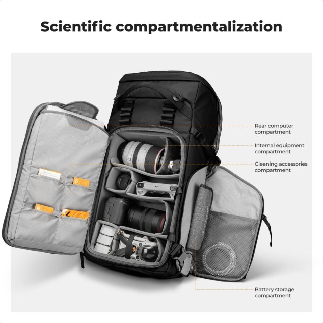Der K&F CONCEPT Star Wander05 40L Kamerarucksack wurde für Fotografen entwickelt, die sowohl viel Stauraum als auch Komfort benötigen. Mit einem Fassungsvermögen von 40 Litern bietet er Platz für 2 DSLR-/SLR-Kameras, bis zu 6 Objektive, Drohnen und eine Reihe von Zubehörteilen und ist mit Geräten von Sony, Canon, Nikon und DJI kompatibel. Sein modulares Design umfasst 8 verstellbare Trennwände, ein oberes Fach für Kleidung, eine Innentasche mit Reißverschluss für Telefone und Akkus, ein unteres Hauptfach für Kameras und Drohnen sowie zusätzlichen Stauraum in der Hüfttasche, dem elastischen Frontfach, den Seitentaschen und dem Laptopfach. Das professionelle Tragesystem verfügt über verstellbare Gurte, ein abnehmbares Lendenkissen, eine atmungsaktive EVA-Rückenstütze und eine obere Reißverschlusstasche für schnell zugängliche Gegenstände und sorgt so für Komfort für alle Körperformen. Dieser Rucksack aus strapazierfähigem und spritzwassergeschütztem 420D-Nylon mit PU-Beschichtung ist ideal für Outdoor-, Reise- und Abenteuerfotografie. Der schnelle seitliche Zugriff ermöglicht es Fotografen, Momente sofort festzuhalten, während die robuste Konstruktion die Ausrüstung in jeder Umgebung sicher aufbewahrt.