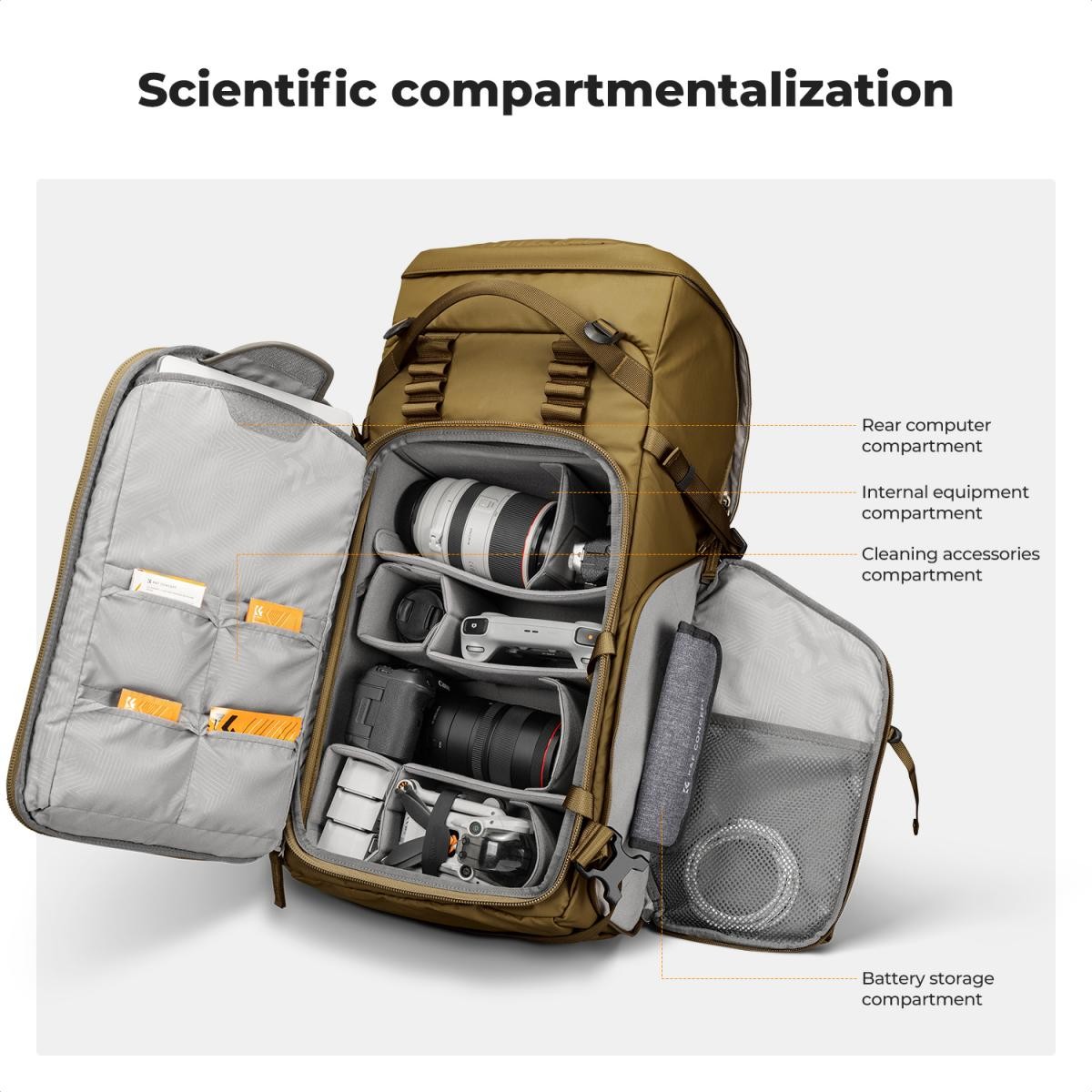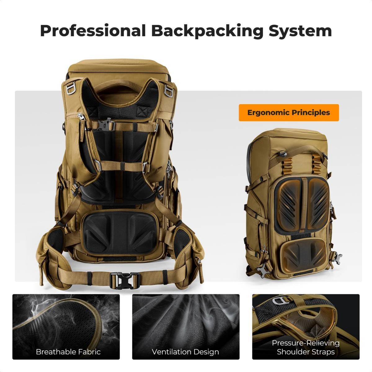 Der K&F CONCEPT Rucksack 40L Star Wander05 (Champagne) ist ein professioneller Outdoor-Fotografie- und Trekkingrucksack, der auf Komfort, Schutz und schnellen Zugriff ausgelegt ist. Mit seinem ergonomischen, dreifach verstellbaren Tragesystem, wetterfesten Materialien und einem modularen, herausnehmbaren Kameraeinsatz ist dieser Rucksack ideal für Fotografen und Abenteurer, die schwere Ausrüstung über lange Strecken transportieren müssen.
