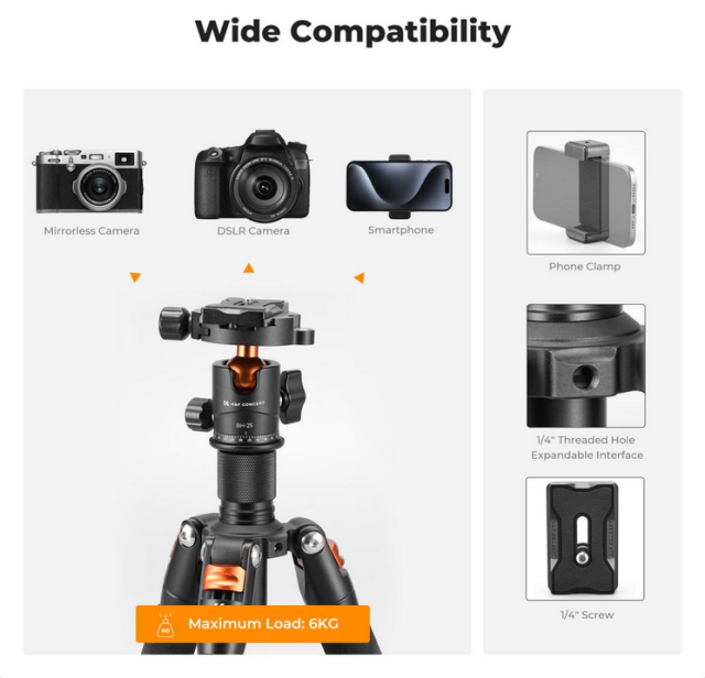 Breite Kompatibilität: Ausgestattet mit einer universellen 1/4"-Schraube kann dieses Stativ leicht an DSLRs, Camcordern, Smartphones und Videoleuchten befestigt werden, was es vielseitig für verschiedene Aufnahmeszenarien macht.