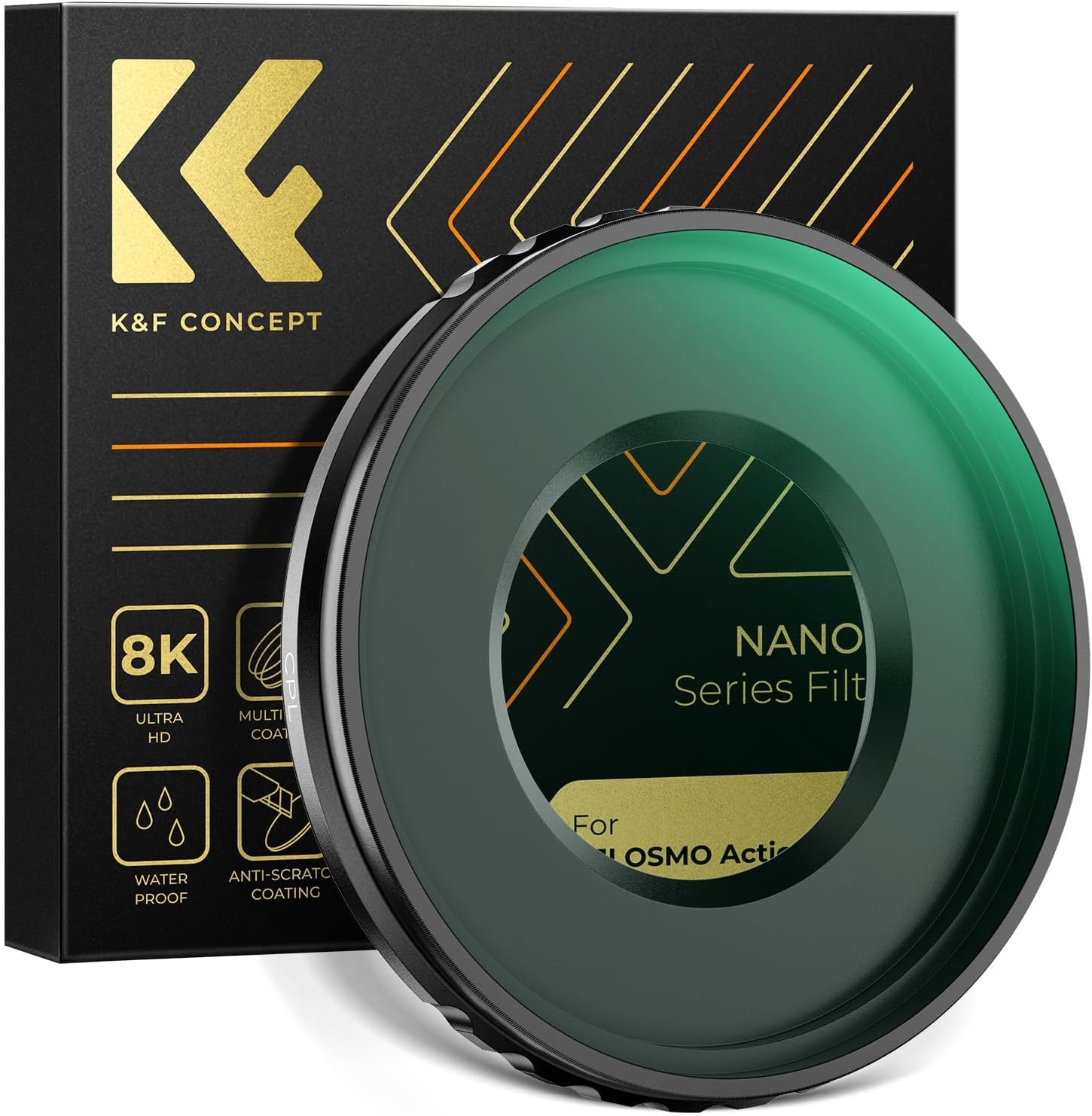 Der K&F Concept CPL-Filter für DJI Osmo Action 4 reduziert Blendeffekte und Reflexionen und verbessert gleichzeitig die Farbsättigung und den Kontrast. Er besteht aus hochwertigem japanischem AGC-Optikglas und einem robusten Rahmen aus Aluminiumlegierung und liefert hochauflösende Bildqualität mit zuverlässigem Schutz für Action-Aufnahmen.