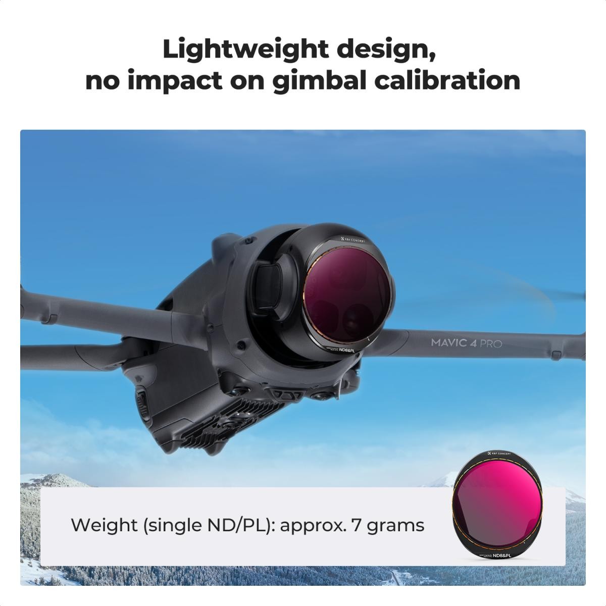 Dieses ND CPL 2-in-1-Filter-Kit wurde speziell für die DJI Mavic 4 Pro entwickelt und enthält 4 Filter: ND8&PL+ND16&PL+ND32&PL+ND64&PL. Einfach zu installieren, gleiche Installationsmethode wie die originale DJI-Objektivschutzfolie. Hergestellt aus importiertem AGC-Optikglas mit Mehrschichtvergütung, reduziert Blendeffekte und Reflexionen und sorgt für die Wiederherstellung der natürlichen Farben des Bildes.