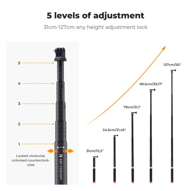 Der K&F Concept Invisible Selfie Stick ist ein hochwertiger Verlängerungsstab aus Kohlefaser, der Ihren Fotos und Videos einen atemberaubenden Nachzieheffekt verleiht, indem er den Selfie-Stick praktisch unsichtbar macht. Perfekt für die Verwendung mit Insta360-Kameras, GoPro und Smartphones. Dieser innovative Selfie-Stick lässt sich auf 127 cm (50 Zoll) verlängern und bietet einen weiten Winkel ohne sichtbare Stockspuren in Ihren Aufnahmen.