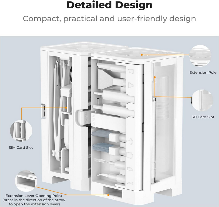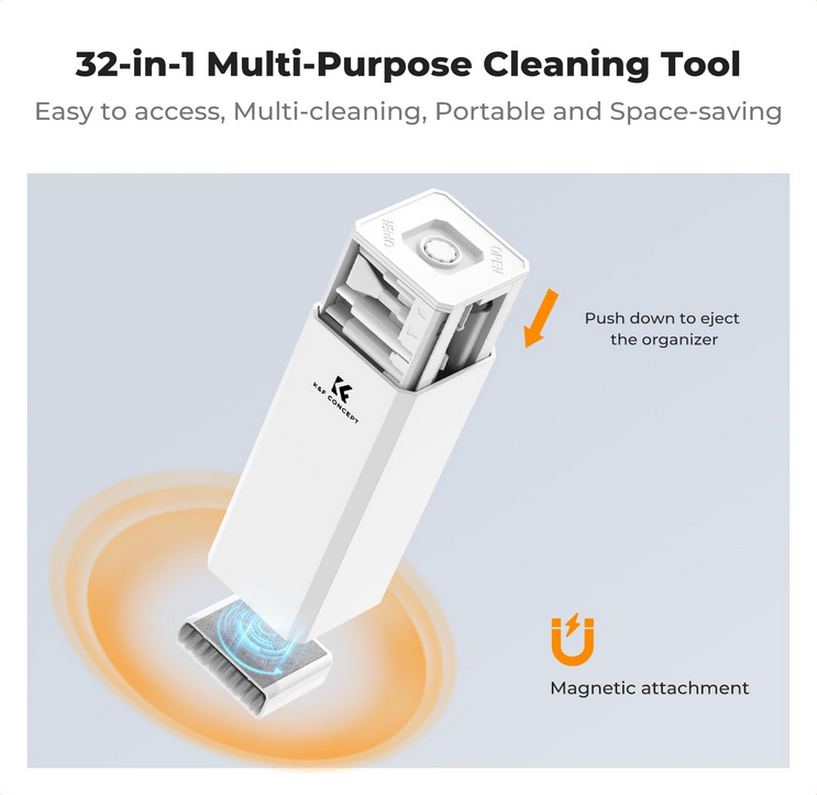 Mit dem K&F Concept 32-in-1-Tastaturreinigungsset, einer vielseitigen All-in-One-Lösung für die mühelose Pflege von Tastaturen, Smartphones, Kopfhörern, Laptops und vielem mehr, erreichen Sie jeden Winkel Ihrer technischen Geräte. Dieses kompakte Kit enthält als Herzstück eine ausziehbare große Bürste, gepaart mit Spezialwerkzeugen wie abgewinkelten Spitzen für Ladeanschlüsse und Lautsprecher, Silikonreinigern für Lightning- und USB-C-Anschlüsse, einem SIM-Karten-Auswerfer und einem Stylus-Stift für präzise Bildschirminteraktion. Entfernen Sie hartnäckigen Schmutz von Kopfhörern mit dem doppelseitigen Reinigungsstift (Metallspitze für hartnäckige Flecken, Minibürste für Gitter), dem runden Schwamm für das Innere von Ladecases und den weichen Bürsten zum Entfernen von Staub – alles ergänzt durch einen ausziehbaren Griff für schwer zugängliche Stellen. Bei Tastaturen entfernt die hochdichte Bürste Oberflächenstaub, während Tastenkappen- und Schalterzieher eine einfache Demontage für mechanische Konfigurationen ermöglichen; für eine gründliche Tiefenreinigung kommen die Bürste mit harten Borsten und die Pinzette hinzu. Eine 5-ml-Sprühflasche (leer, bereit für Ihre Reinigungslösung) sorgt in Kombination mit Fasertüchern dafür, dass Fingerabdrücke und Fettflecken von Bildschirmen von Smartphones, Tablets oder Monitoren verschwinden. Der ergonomische Hauptkörper dient gleichzeitig als sichere Aufbewahrungsmöglichkeit für SD-/SIM-Karten, sodass alles organisiert und transportabel bleibt. Dieses Kit wurde für den täglichen Gebrauch bei kleinen Elektronikgeräten entwickelt und sorgt mit langlebigen, integrierten Werkzeugen, die jeder Reinigungsaufgabe gewachsen sind, für streifenfreie und beschädigungsfreie Ergebnisse.