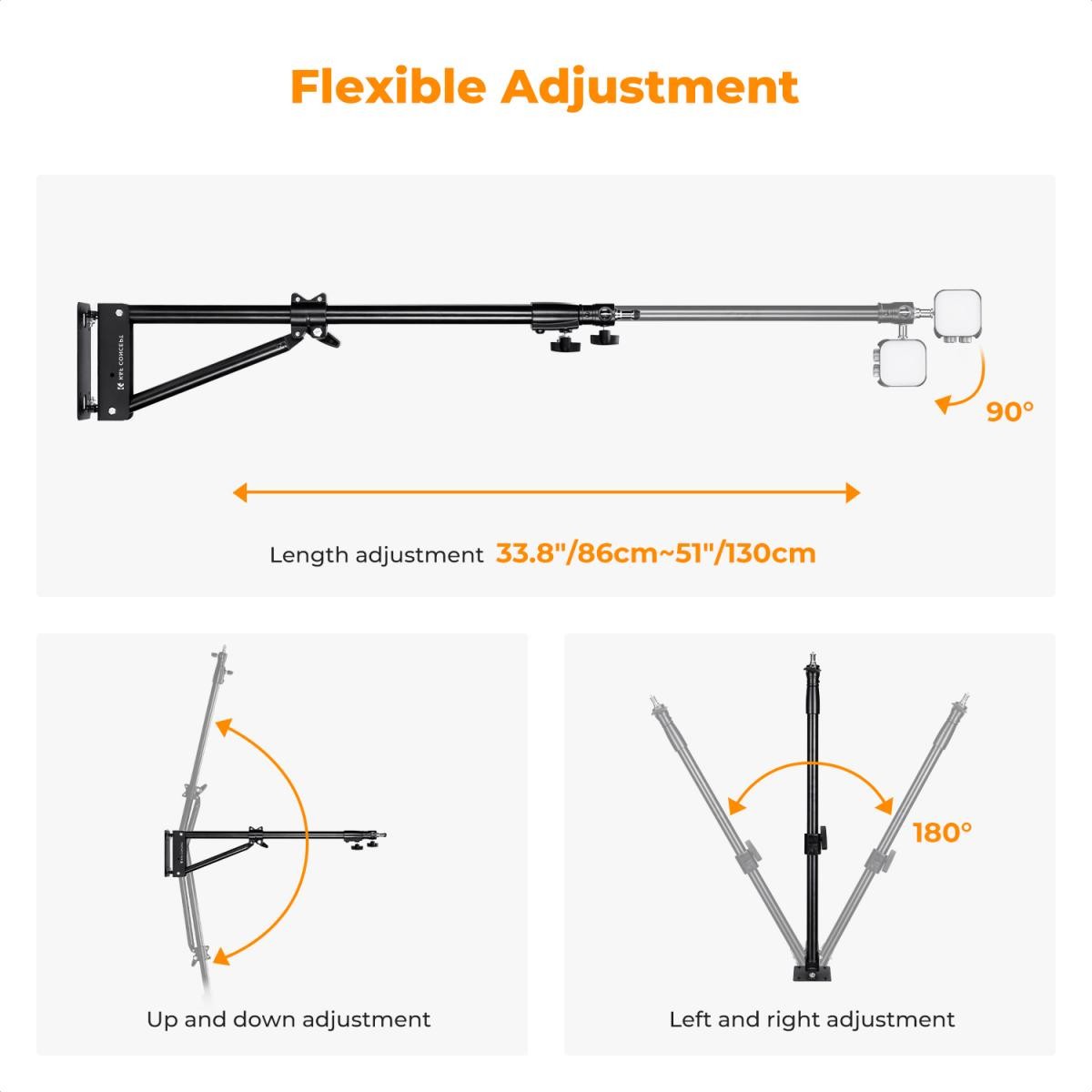 Der ausziehbare Arm bietet eine vertikale Drehung um 180° und eine horizontale Drehung um 180°, wodurch verschiedene Winkel eingestellt werden können. Der Arm kann platzsparend direkt an die Wand geklappt werden. Er eignet sich ideal für die Montage von Fotolampen, Überwachungsgeräten oder Monitoren. Er ermöglicht komplexe Positionierungen wie Neigen, Drehen und Ausziehen.