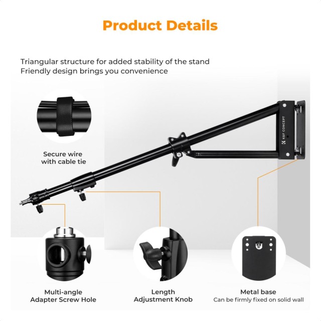 Lässt sich sicher an der Wand befestigen und bei Nichtgebrauch auf kompakte 93,5 cm (36,8") zusammenklappen, wodurch wertvoller Platz auf dem Boden frei wird und Ihr Studio aufgeräumt bleibt. Der Auslegerarm lässt sich um 180° vertikal und um 180° horizontal drehen und ermöglicht so vielseitige Winkelverstellungen. Bei Nichtgebrauch kann er platzsparend flach an die Wand geklappt werden. Er eignet sich ideal für die Befestigung von Fotolampen, Überwachungsgeräten oder Monitoren und erfüllt komplexe Positionierungsanforderungen wie Neigen, Schwenken und Ausfahren.