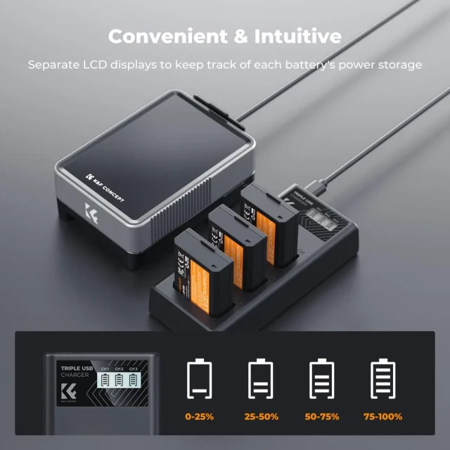 K&F Concept LP-E10 Akku 3er-Pack und verbessertes LCD-Ladegerät. Das Ladegerät mit drei Steckplätzen kann 3 LP-E10-Akkus gleichzeitig effizient aufladen, und der LCD-Bildschirm zeigt den Ladezustand jedes Akkus deutlich an.