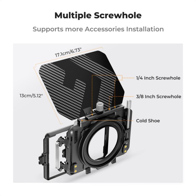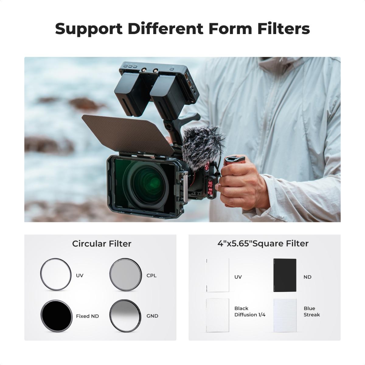 - 【Vielseitiges und sicheres Filtersystem】Die Mattebox kann zwei 4x5,65" große Filter mit einer Dicke von 4 mm aufnehmen und verfügt über einen sicheren Verriegelungsmechanismus. Erfüllt die Anforderungen für Aufnahmen in verschiedenen Szenen.