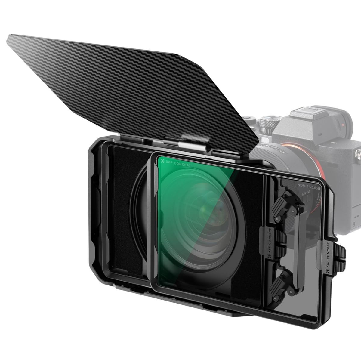 Leichte Mattebox aus Kohlefaser mit ausgestellter 34-mm-Konstruktion verhindert Vignettierung und Streulicht und sorgt für klare, kontrastreiche Aufnahmen mit Objektiven ab 16 mm. Bietet Platz für zwei 4x5,65-Zoll-Filter mit sicherer Verriegelung, inklusive 5 Adapterringen (67–95 mm), Erweiterungsanschlüssen, Aufbewahrungstasche und ND8-Filter mit 28-lagiger Nanobeschichtung für 4K/8K-Beständigkeit.