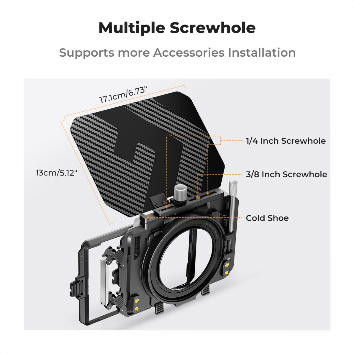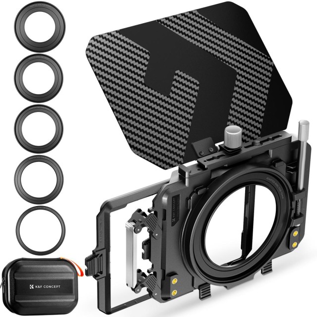 K&F Concept Matte Box Kit: Leichte Matte Box aus Carbonfaser mit 5 Adapterringen (67/72/77/82/95 mm) + 2 Filterablagen für 4x5,65"-Filter – verhindert Streulicht, vignettierungsfrei für 16-mm-Objektive, erweiterbar mit Anschlüssen und Aufbewahrungstasche.