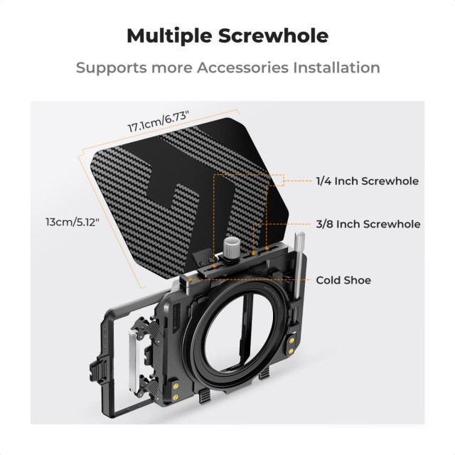 Schützen Sie Ihre filmische Vision vor unerwünschten Reflexionen mit dem K&F Concept Matte Box Kit, einer professionellen Lösung für DSLR- und spiegellose Kameras, die makellose, kontrastreiche Aufnahmen liefern. Diese 34 mm dicke Matte Box aus ultraleichter Kohlefaser mit eleganter matter Oberfläche und innovativer Blende blockiert Streulicht effektiv und verhindert Vignettierung – selbst bei Superweitwinkelobjektiven mit 16 mm Brennweite (Hinweis: nicht kompatibel mit Sony FE PZ 28-135 mm f/4 OSS). Das vielseitige Dual-Tray-System hält zwei 4x5,65-Zoll-Filter (bis zu 4 mm dick) mit einem zuverlässigen Verriegelungsmechanismus sicher fest und ermöglicht einen nahtlosen Wechsel für ND, Diffusion oder Farbkorrekturen in dynamischen Szenen. Fünf Präzisionsadapterringe (67/72/77/82/95 mm) gewährleisten eine breite Objektivkompatibilität, während integrierte 1/4"- und 3/8"-Anschlüsse sowie Kaltschuhanschlüsse unzählige Befestigungsmöglichkeiten für Mikrofone, Monitore oder Follow-Focus bieten. Dank seitlicher und schienenförmiger Erweiterungsplatten ist es zukunftssicher und lässt sich mühelos an sich weiterentwickelnde Setups anpassen. Dieses Kit wird mit einer schützenden Aufbewahrungstasche geliefert und bietet Mobilität und Langlebigkeit für Run-and-Gun-Filmemacher, Naturvideografen oder Studio-Profis – und wertet jeden Frame mit optischer Reinheit und kreativer Freiheit auf.