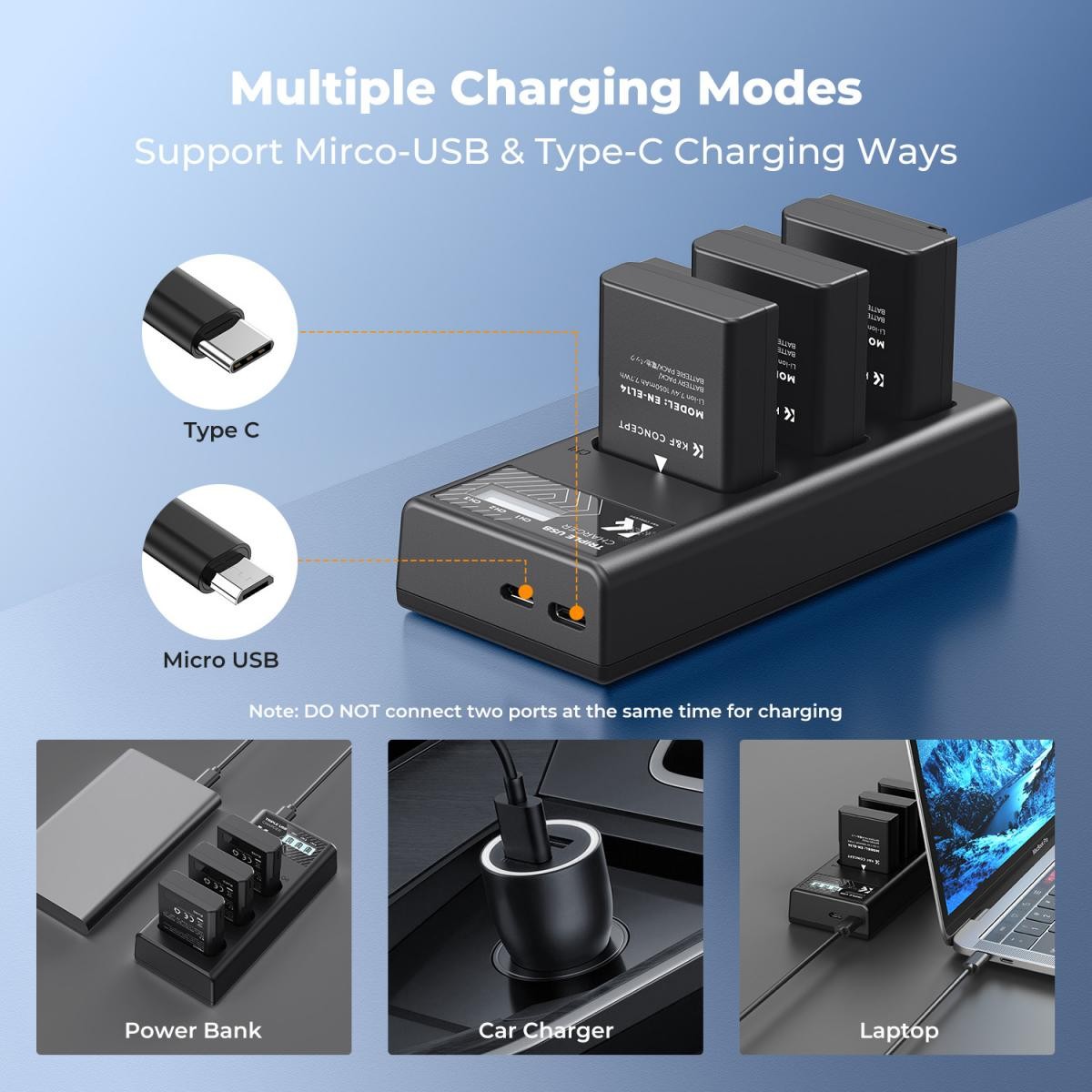 K&F Concept 3er-Pack Nikon EN-EL14 Kamera-Akkus mit 3-Slot-LCD-Ladegerät. Enthält 1050-mAh-EN-EL14-Akkus und ein LCD-Display-Ladegerät mit zwei Micro-USB-/Typ-C-Eingängen für schnelles und sicheres Laden.