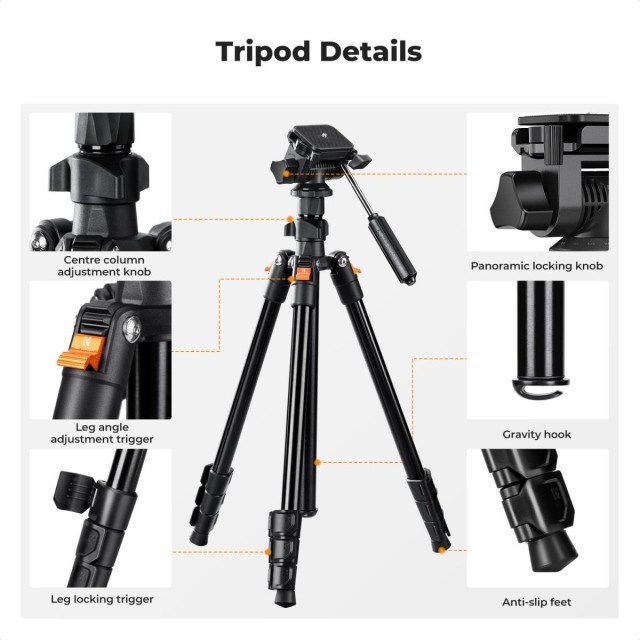 Das Stativ vereint Funktionalität und Tragbarkeit. Mit seinem 4-teiligen Beindesign erreicht es eine maximale Höhe von 196 cm. Nach dem Abnehmen des Kopfes lässt sich das Stativ zusammenklappen und hat dann eine Größe von nur 43 cm, sodass es problemlos in einem Rucksack oder einer Kameratasche verstaut werden kann.