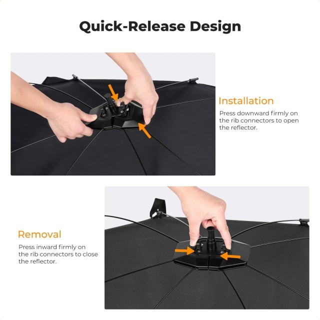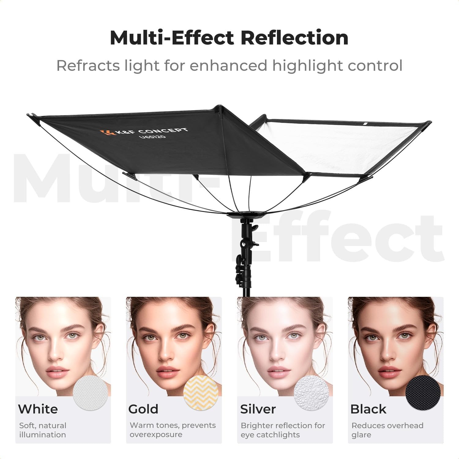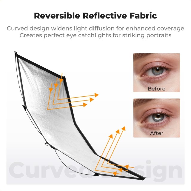 Der K&F CONCEPT Quick-Release Curved Reflector ist ein leichter, tragbarer Reflektor mit den Maßen 123 × 65 cm, der für weiches, schmeichelhaftes Licht entwickelt wurde. Mit seinen 4-in-1-Magnetabdeckungen, der um 180° verstellbaren Basis und der Schnellbefestigung eignet er sich perfekt für Porträts im Freien, Außenaufnahmen und Catchlights in professioneller Qualität.