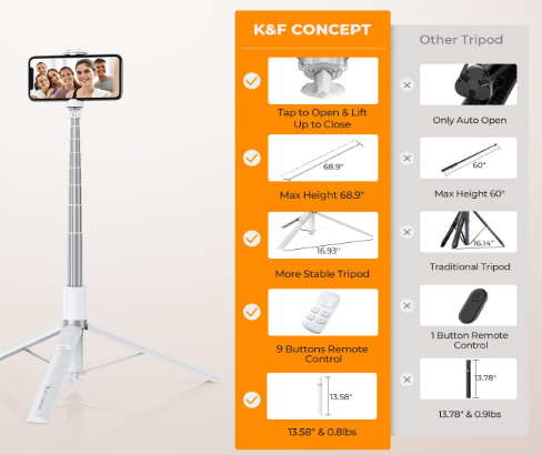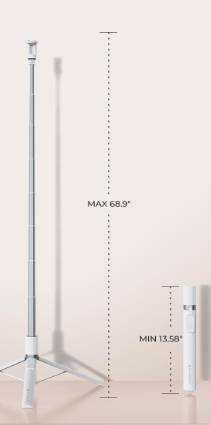 Der K&F Concept Aluminium Selfie Stick X96 70-inch ist ein vielseitiges, leichtes (0,8 lb/376 g) Stativ aus Aluminiumlegierung mit innovativer magnetischer Saugnapfhalterung zum automatischen Öffnen und Schließen für mühelose Einhandbedienung, das sich von 13,6 bis 68,9 Zoll ausziehen lässt und stabile Weitwinkelaufnahmen ermöglicht. Mit einer 360°-Horizontal- und 180°-Vertikal-Doppelachsenrotation, einer wiederaufladbaren Bluetooth-Fernbedienung mit 9 Tasten für Fotos, Zoom, Kamerawechsel und Videosteuerung sowie universeller Kompatibilität mit Smartphones mit einer Breite von 5,5 bis 8,5 cm und einem Blitzschuh für Mikrofone/Leuchten ist es der ultimative tragbare Begleiter für Reise-Vlogs, Live-Streams und Familienfotos.
