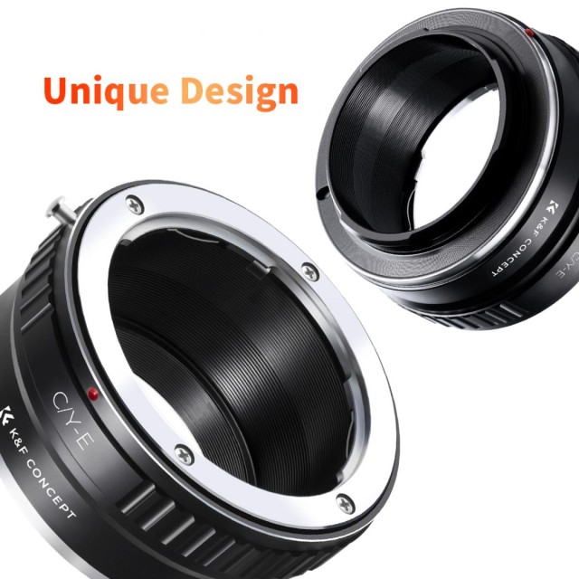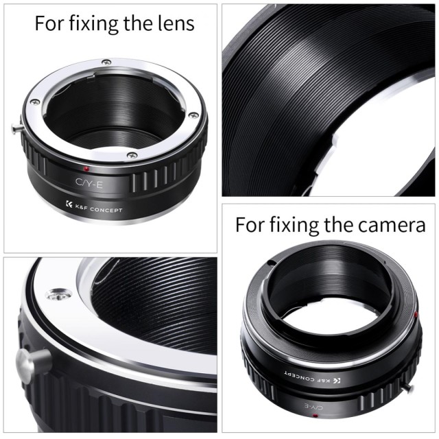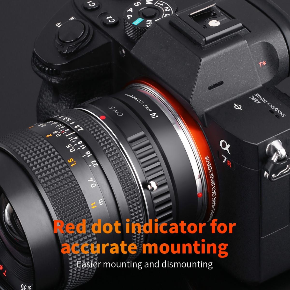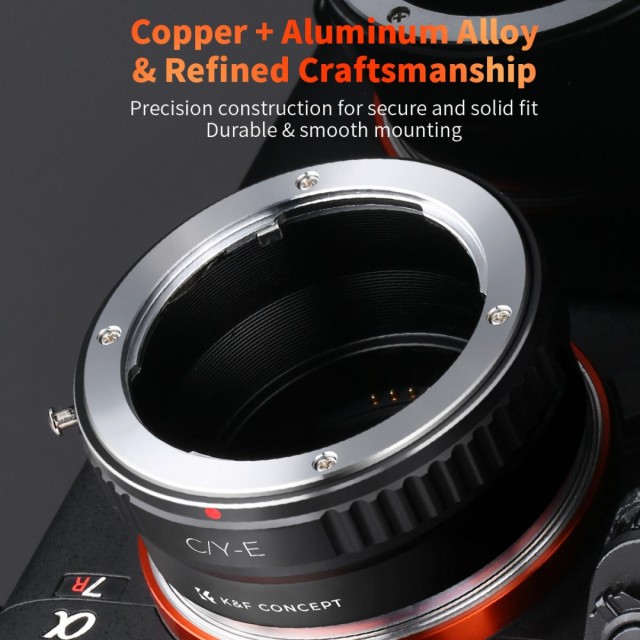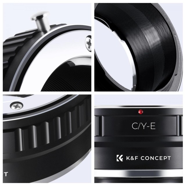 Der K&F Contax/Yashica (C/Y) zu Sony E-Mount Adapter ermöglicht die Montage von Contax- und Yashica-Objektiven auf spiegellosen Sony E-Mount-Kameras. Er zeichnet sich durch eine robuste Konstruktion aus eloxiertem Aluminium, manuelle Bedienung und Unterstützung für Unendlichkeitsfokus aus.