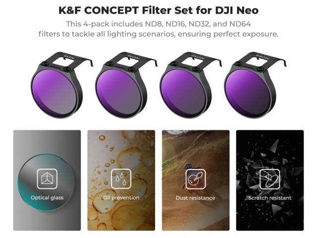 Das K&F DJI NEO 4pcs Filter Kit bietet essentielle ND- und Polarisationsfilter zur Verbesserung der Belichtung, zur Reduzierung von Blendeffekten und zur Verbesserung der Farben für die DJI NEO Drohnenfotografie, mit einem langlebigen, wasserdichten und kratzfesten Design für hochwertige Aufnahmen unter allen Bedingungen.