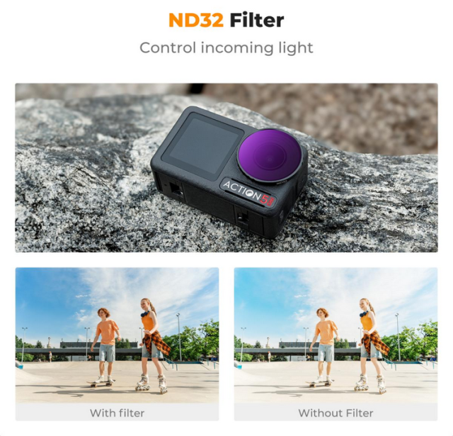 Ganz gleich, ob Sie Ihre Abenteuer in hellem Sonnenlicht oder bei bewölktem Himmel aufnehmen, dieser ND32-Filter verbessert die Leistung Ihrer DJI Osmo Action 4/5 Pro und sorgt für gestochen scharfe, lebendige und verzerrungsfreie Bilder.