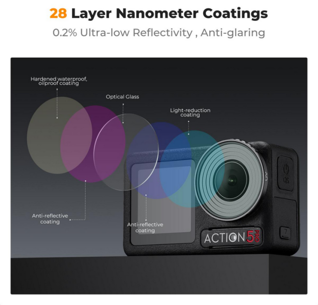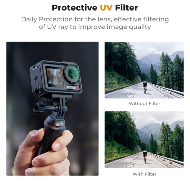 - Objektivschutz mit UV-Schutz: Dieser Filter blockiert effektiv UV-Strahlen, reduziert deren Auswirkungen auf die Bildklarheit und schützt das Objektiv Ihrer Action-Kamera vor Kratzern, Staub und Wasser.