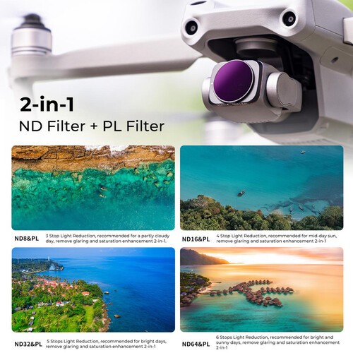 Das 4-teilige ND/PL-Filterset von K&F Concept für DJI Air 2S kombiniert Neutraldichte- und Polarisationsfunktionen, um das Licht um 2 bis 6 Blendenstufen zu reduzieren, Blendeffekte zu eliminieren und die Farbsättigung zu verbessern. Jeder Filter verfügt über eine 28-lagige Nanometer-Mehrfachbeschichtung für wasserdichten, kratzfesten Schutz und ist ultraleicht, um die Stabilität des Gimbals zu gewährleisten.
