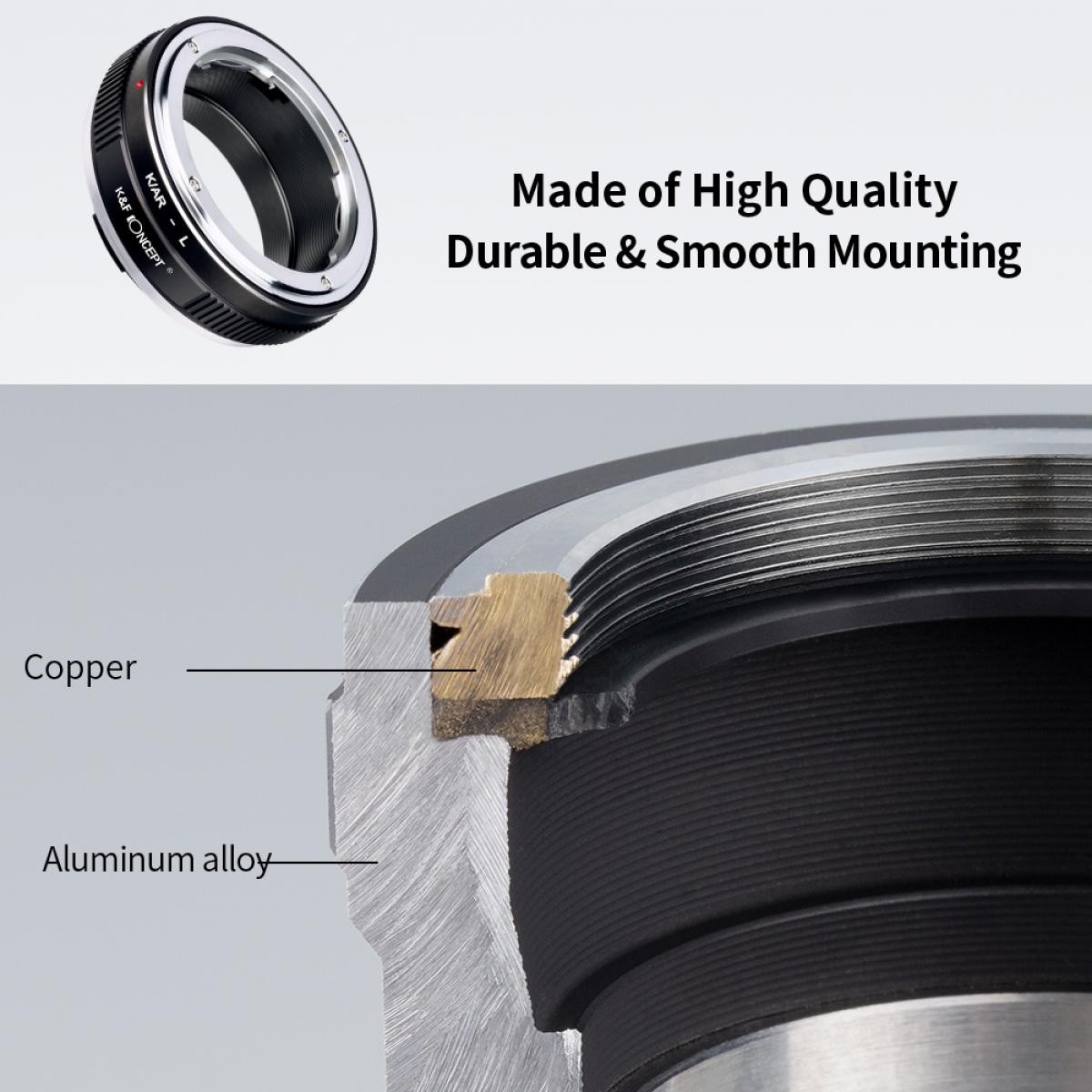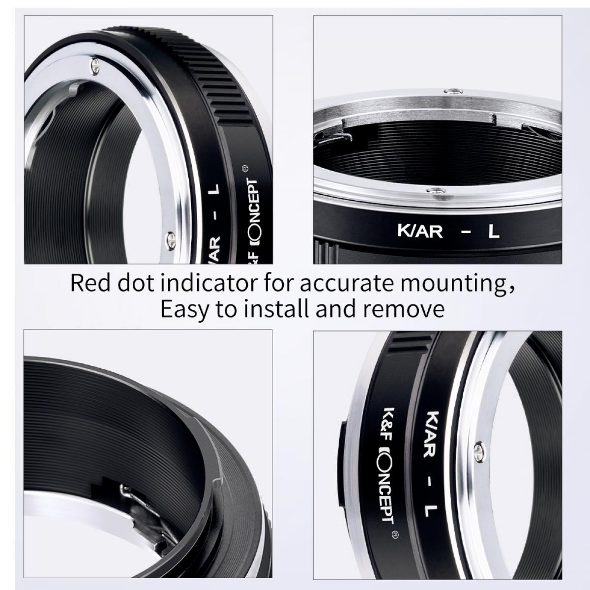 Der hochpräzise Objektivadapter K/AR-L von K&F ermöglicht die Verwendung von Konica-Objektiven mit AR-Anschluss an Leica-Kameras mit L-Anschluss. Er besteht aus Kupfer und einer Aluminiumlegierung und bietet eine reibungslose Montage, manuelle Blendensteuerung über den integrierten Blendenring und Unterstützung für Unendlich-Fokus.