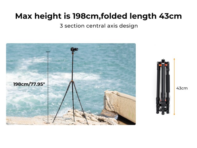 Das innovative 3-Sektionen-Design mit zentraler Achse ermöglicht dem Stativ eine größere Aufnahmehöhe von 198 cm bei einer kompakten Länge von 43 cm im zusammengeklappten Zustand. Das Stativ kombiniert praktische Funktionen und Tragbarkeit mit einer maximalen Höhe (ohne Mittelsäule) von 135 cm und bietet mühelose Stabilität und eine optimierte Aufnahmehöhe, die sich sowohl für den Innen- als auch für den Außeneinsatz eignet. Die maximale Höhe beträgt 198 cm, was das Fotografieren im Stehen so einfach wie nie zuvor macht. Die Mindesthöhe beträgt 56 cm, wodurch sich das Gerät an nahezu alle Bedingungen und Umgebungen anpassen lässt.