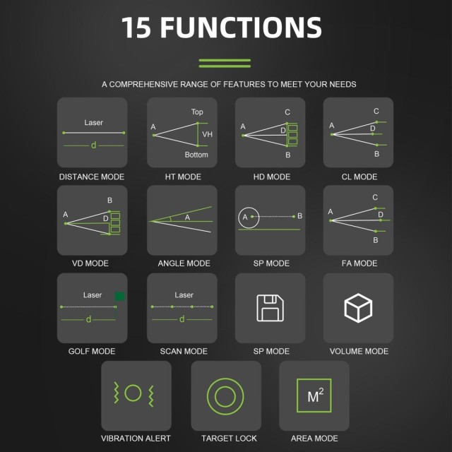 * 15 Funktionen und automatische Datenspeicherung: Entfernungsmessung, Zweipunkt-Höhenmessung, horizontale Entfernung, nächstgelegene Entfernung, vertikale Höhe, Geschwindigkeitsmessung, Volumenmessung und viele weitere 15 nützliche Messungen mit einem umfassenden Funktionsumfang für Ihre unterschiedlichen Anforderungen. Der vor dem Ausschalten verwendete Modus wird nach dem Ausschalten gespeichert und bleibt beim nächsten Einschalten erhalten, ohne dass Sie ihn erneut einstellen müssen.