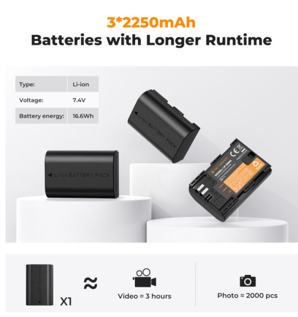 Das Set enthält drei Lithium-Ionen-Akkus mit hoher Kapazität (2250 mAh), die jeweils 7,4 V und 16,6 Wh liefern. Dies sorgt für eine längere Aufnahmezeit und reduziert die Notwendigkeit häufiger Akkuwechsel bei langen Einsätzen. Diese Akkus sind als zuverlässiger Ersatz für die Akkutypen LP-E6, LP-E6N und LP-E6NH konzipiert.