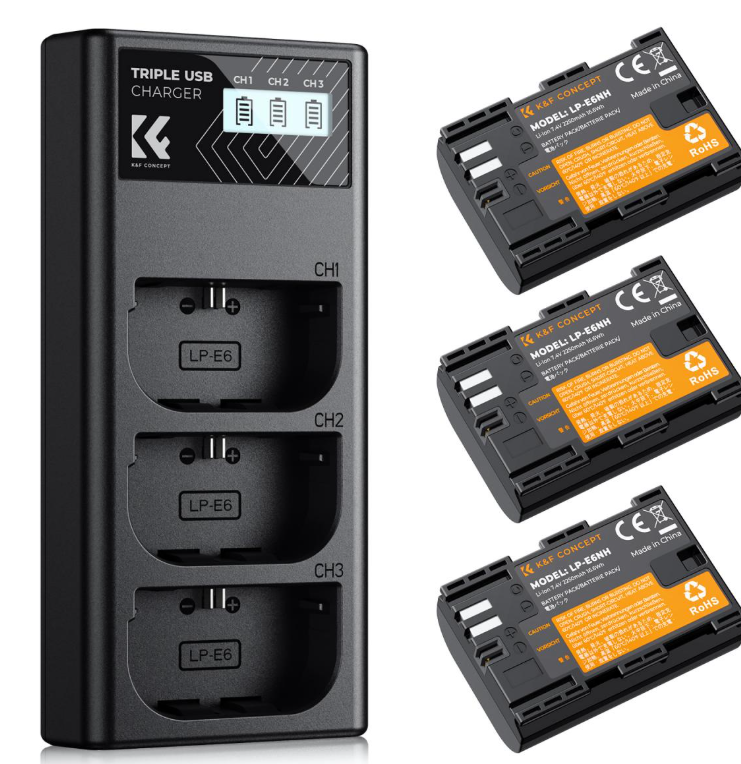 Dieses LP-E6/LP-E6NH-Akku- und 3-fach-Ladegerät-Set ist eine umfassende Stromversorgungslösung für Fotografen und Videografen, die Canon-Kameras verwenden, die mit Akkus der LP-E6-Serie betrieben werden. Es ist mit einer Vielzahl von Modellen kompatibel, darunter die Canon EOS R5, Canon EOS R6, Canon EOS R sowie DSLR-Modelle wie die 5D- und 7D-Serie.