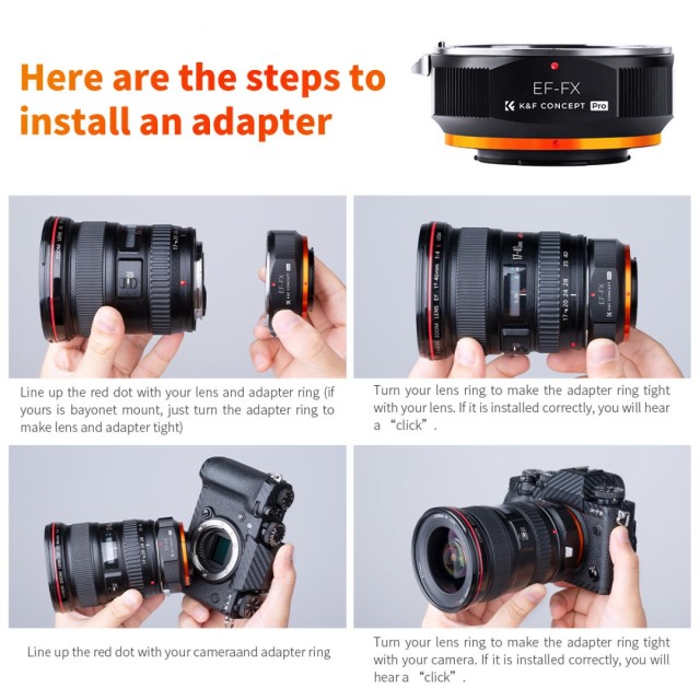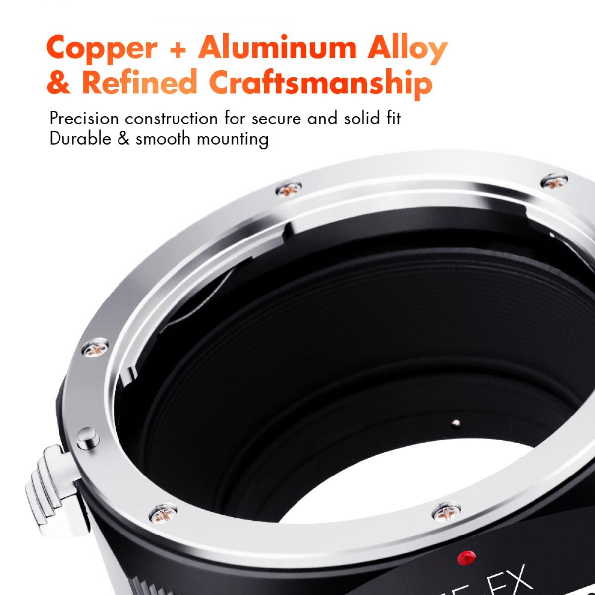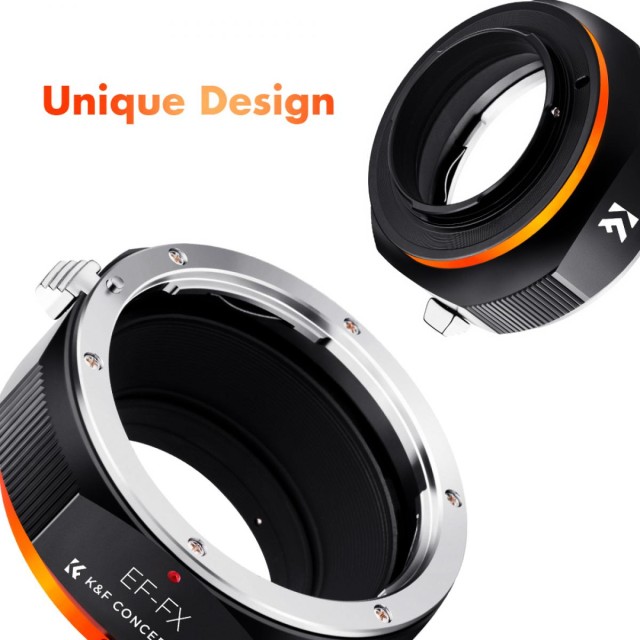 Der K&F Concept M12115 New Design High Precision Lens Adapter Mount ermöglicht die Verwendung von Canon EF- und EF-S-Objektiven an spiegellosen Fuji FX-Mount-Kameragehäusen, wie der X-Pro1, X-T1 oder X-E2. Der Adapter besteht aus einer robusten Ganzmetallkonstruktion mit einer gehärteten Eloxalbeschichtung und ist somit langlebig und widerstandsfähig. Er unterstützt den manuellen Fokus, die manuelle Blendensteuerung und die Fokussierung auf unendlich und bietet dem Fotografen damit volle kreative Kontrolle. Die matte Innenseite reduziert interne Reflexionen, während der deutlich markierte rote Ausrichtungspunkt ein schnelles und einfaches Anbringen des Objektivs ermöglicht.