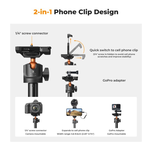 MS04 62''/1,58 m Stativ-Selfie-Stick, schwarz und orange, mit Bluetooth-Fernbedienung + GoPro-Adapter. Die maximale Höhe beträgt 157,8 cm und das Stativ verfügt über 7-fach verstellbare Beine. Sie können die gewünschte Höhe nach Belieben einstellen. Der Stativkopf hat eine Tragkraft von 3 kg und eignet sich für die meisten spiegellosen Kameras, Mobiltelefone…