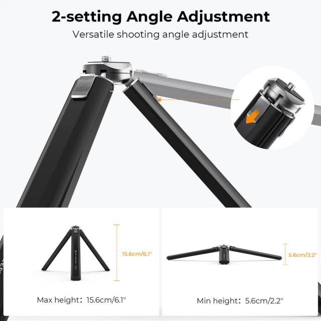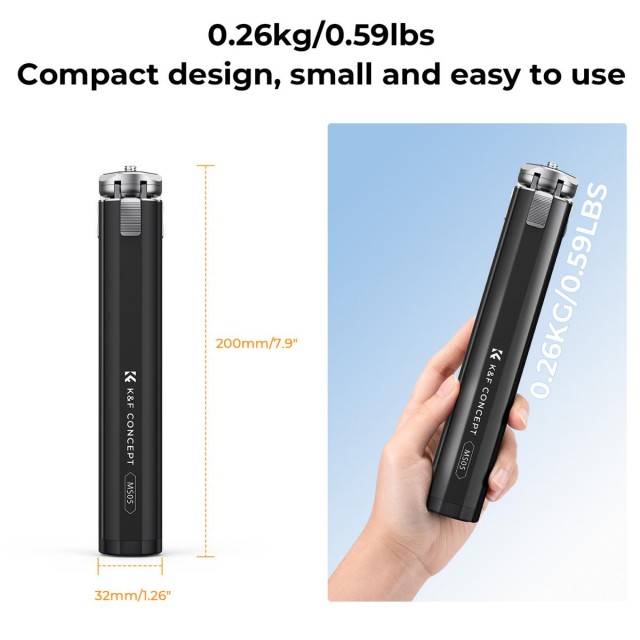 Das K&F MS05 ist ein leichtes und robustes Mini-Stativ aus Metall für Smartphones und Kameras. Es verfügt über eine 2-stufige Höhenverstellung, eine 1/4-Zoll-Schraubgewindeaufnahme mit einer robusten Tragkraft von 20 kg und ein rutschfestes Design für stabilen Halt bei allen Aufnahmen.