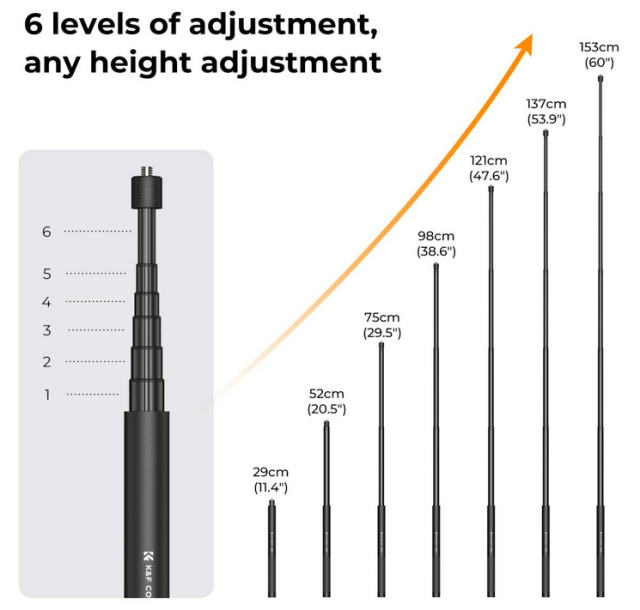 Der K&F MS07 ist ein vielseitiger, extralanger 60''-Verlängerungsstab, ideal für Panoramaaufnahmen und entfernte Nahaufnahmen. Dieser Selfie-Stick wurde sowohl für professionelle Fotografen als auch für Amateure entwickelt und sorgt dafür, dass Ihr Aufnahmebereich nicht mehr begrenzt ist. Die Konstruktion aus einer hochwertigen Aluminiumlegierung garantiert Langlebigkeit, während der 1/4-Zoll-Anschluss an der Basis eine einfache Montage auf einem Stativ ermöglicht. Das Zugrohrdesign bietet soliden Halt und Stabilität, und der Silikongriff sorgt für einen bequemen Griff während der Verwendung.