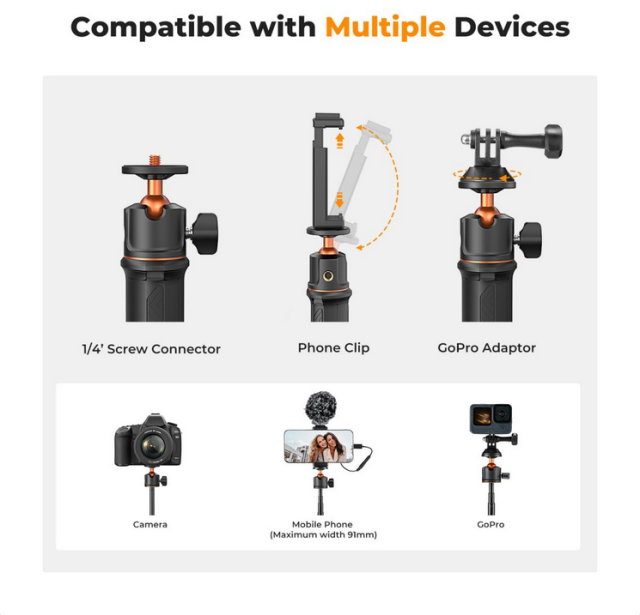 Das K&F MS11 Stativ ist eine vielseitige und leichte Lösung für Benutzer von Handys und Action-Kameras. Es verfügt über eine Handyklemme, die Geräte mit einer maximalen Breite von 91 mm unterstützt, wodurch es ideal für Videoaufnahmen und -übertragungen ist. Der mitgelieferte GoPro-Adapter erweitert die Verwendung auf Action-Kameras wie GoPro, DJI Osmo…