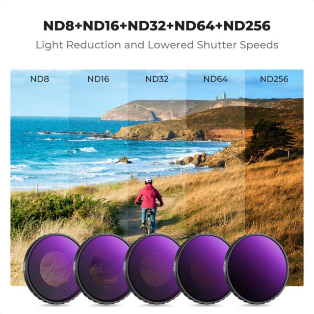 Mit CPL- und ND8-, ND16-, ND32-, ND64- und ND256-Filtern ausgestattet, die die meisten Anforderungen an die Lichtreduzierung und die Eliminierung von reflektiertem Licht erfüllen können, wodurch sich die Anschaffungskosten und die Einkaufsmöglichkeiten verringern. ND8, ND16, ND32, ND64, ND256 können die Belichtung um 3 bis 8 Blendenstufen reduzieren und eignen sich für Umgebungen, die längere Belichtungszeiten, aber stärkeres Licht erfordern. CPL-Filter können Reflexionen und Streulicht minimieren und die Bildqualität verbessern.