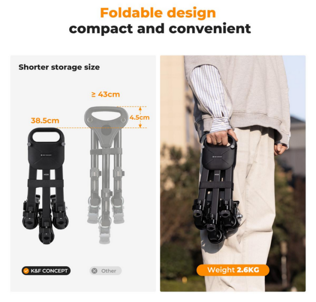 - Leicht und tragbar: Durch das Zusammenklappen auf eine kompakte Größe von 38,5 cm und ein Gewicht von nur 2,6 kg ist dieser Stativwagen leicht zu transportieren. Der ergonomische Griff und die mitgelieferte Aufbewahrungstasche machen ihn zu einem praktischen Begleiter für Profis, die viel unterwegs sind.