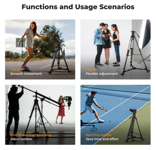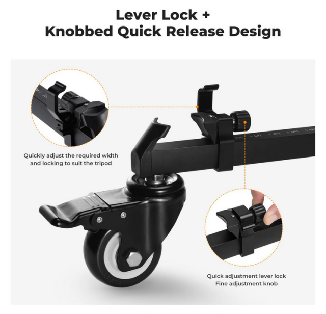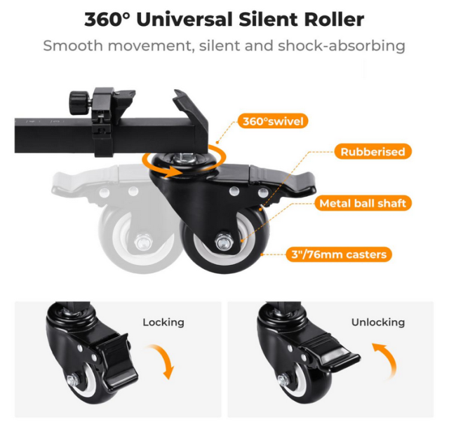 - Große, robuste Räder: Ausgestattet mit geräuscharmen 360° 3-Zoll-Rädern mit Metallkugellagern und Gummikonstruktion, bietet der Dolly eine reibungslose, geräuschlose Bewegung und gewährleistet stabile Aufnahmen auch auf unebenen Oberflächen.