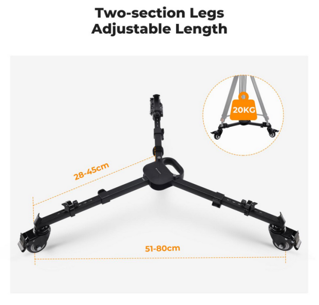 - Starke Belastbarkeit: Der aus einer haltbaren Aluminiumlegierung gefertigte Dolly kann mit bis zu 20 kg belastet werden und ist somit auch für schwere Foto- und Videoausrüstungen geeignet.