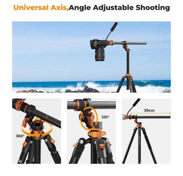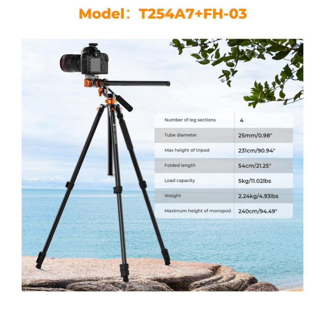 Das K&F T254A7+FH-03 Stativ mit hydraulischem Kopf bietet vielseitige und reibungslose Überkopf- und Panoramaaufnahmen. Die patentierte Mittelachse ermöglicht eine Neigung von 0-120° und eine horizontale Verstellung von 360°, wodurch verschiedene Winkel unterstützt werden. Der hydraulische Kopf mit einer Tragfähigkeit von 5 kg sorgt für stabile, reibungslose Bewegungen und unterstützt +90°/-90° Neigung und 360° Panoramaaufnahmen. Das Stativ ist bis zu 2,31 m ausziehbar und lässt sich auf 54 cm zusammenklappen, wobei eine 28-mm-Mittelachse für Stabilität sorgt. Es verfügt über eine horizontale 360-Grad-Skala für einfache Panoramafotos und ein abnehmbares Einbeinstativ, das sich auf bis zu 2,4 Meter ausziehen lässt, um Flexibilität in engen Räumen zu gewährleisten.
