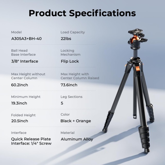 Das K&F Concept A305A3+BH-40 ist ein kompaktes, leichtes Aluminiumstativ, das für Fotografen und Content-Ersteller entwickelt wurde, die Stabilität, Vielseitigkeit und Tragbarkeit benötigen. Mit einem 40-mm-Kugelkopf, einer 360°-Panorama-Drehung und einer verstellbaren Mittelsäule unterstützt es Kameras, Smartphones und Tablets für Reisen, Studio- und Außenaufnahmen.