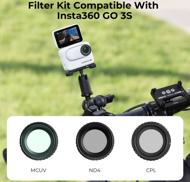 Das K&F UV+CPL+ND4 Filter Kit für die Insta360 GO 3S Action-Kameras enthält mehrfach vergütete Filter zum Schutz des Objektivs und zur Verbesserung der Bildqualität durch Reduzierung von Blendeffekten, Trübungen und Lichtkontrolle.