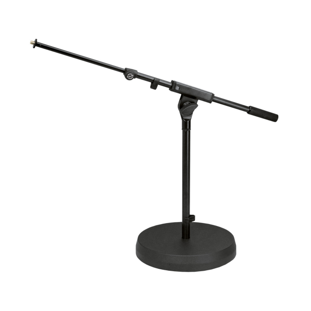 Flaches Mikrofonstativ mit runder Basis und ausziehbarem Arm, entwickelt für Bass Drums und akustische Instrumente. Schwerer Rundsockel aus Gusseisen mit vibrationsdämpfendem Gummieinsatz zur Geräuschfilterung.