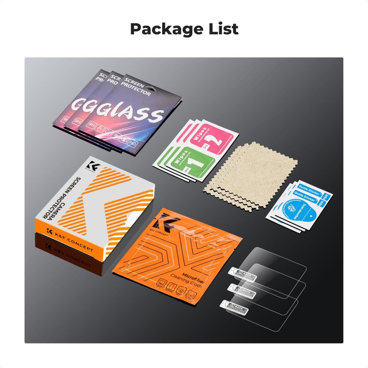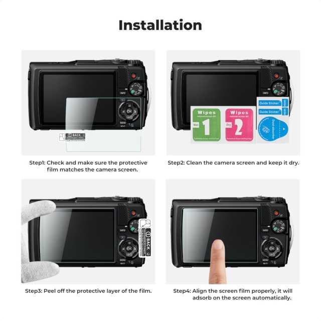 Diese Schutzfolien wurden speziell für die Kameras Olympus TG-7, TG-6, TG-5 und TG-4 entwickelt. Die Packung enthält 3× Schutzglas für das Display und 3× Abdeckung für die Schiene für eine präzise Installation ohne Luftblasen.