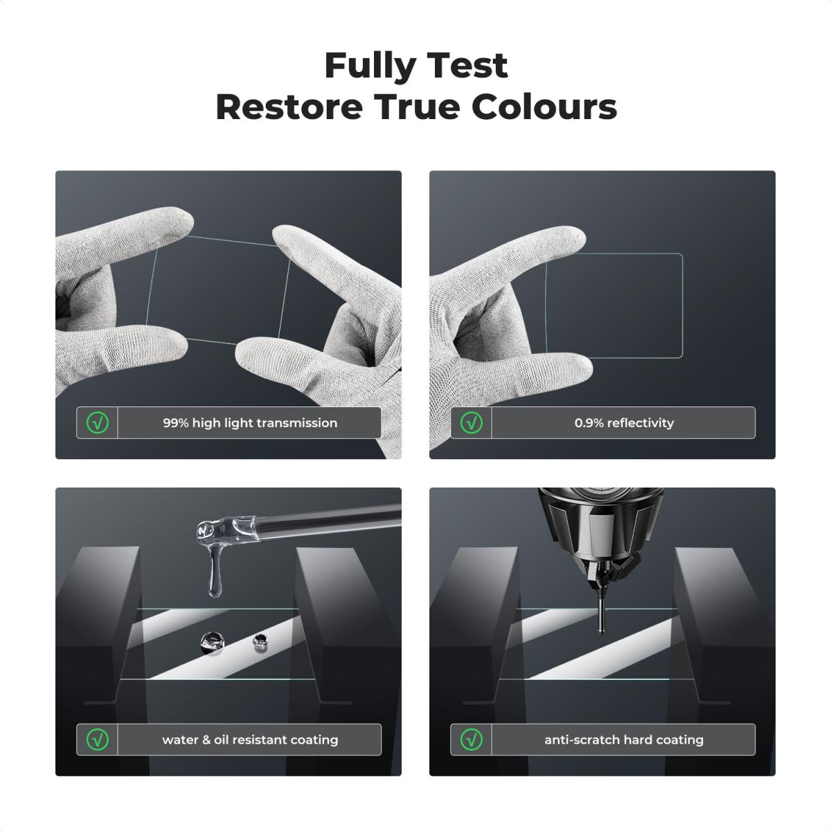 Mit einer Transparenz von 99,99 % HD bewahrt das Schutzglas die ursprüngliche Bildqualität. Die hydrophobe Oberflächenbeschichtung weist Fingerabdrücke ab und sorgt dafür, dass das Display berührungsempfindlich bleibt.