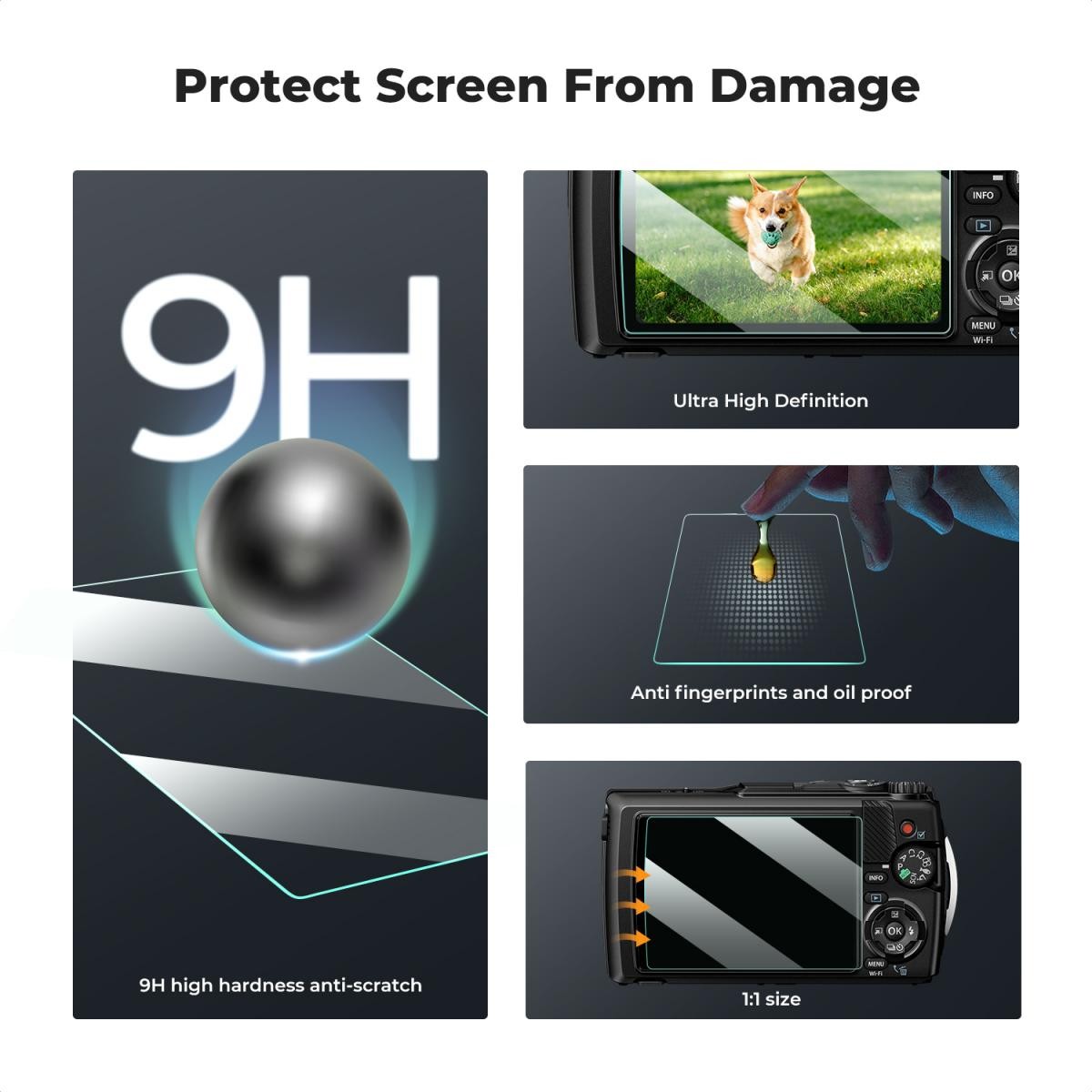 Hergestellt aus hochwertigem gehärtetem Glas mit einer Härte von 9H, das eine hervorragende Kratz- und Durchstoßfestigkeit bietet und das Display Ihrer Kamera zuverlässig schützt.