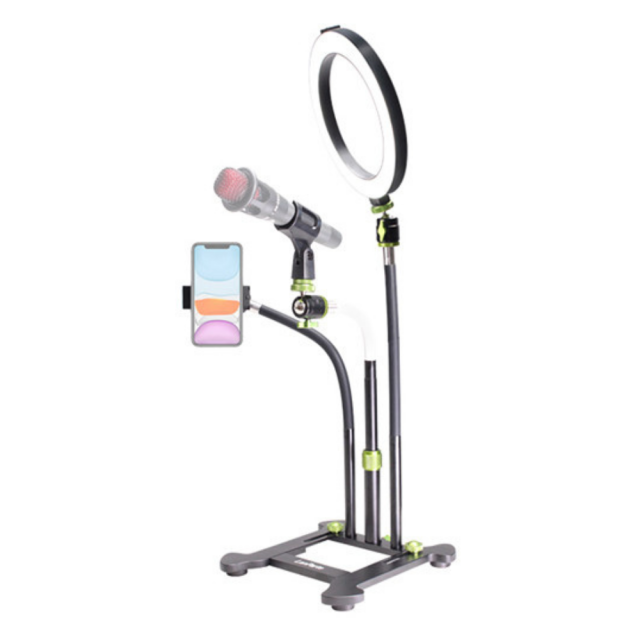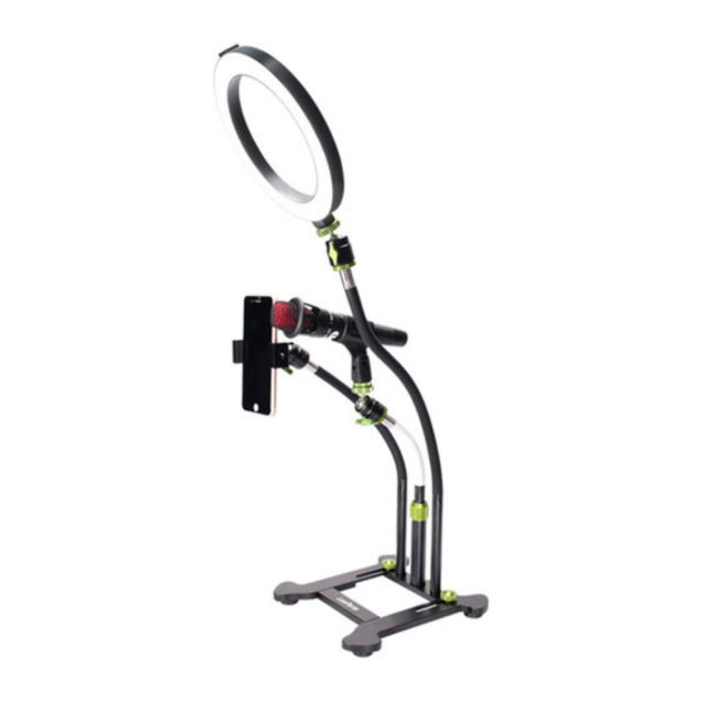 Filmen Sie Vlogs, Livestreams und vieles mehr von jeder flachen Oberfläche aus mit dem Livestream Desktop Smartphone Stand von LanParte. Der Tischständer verfügt über drei verstellbare Schwanenhalsarme, die in einem Mikrofonhalter, einer Smartphone-Klemme und einer Halterung für ein LED-Ringlicht enden, alle mit voll verstellbaren Kugelgelenken. Mit all dem optionalen Zubehör bietet Ihnen dieser Ständer alles, was Sie brauchen, um Ihre Inhalte für einen ausgefeilten und professionellen Look aufzuwerten.