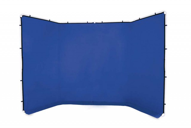 Vollständig verspannt kann er z. B. an eine Wand gelehnt werden, oder durch leichtes Versetzen der Seitenrahmen auf jeder ebenen Fläche ohne Stütze stabilisiert werden. Die Farbvariante Chroma Key Blue (Keying Green) wird einfach mit den mitgelieferten Haken an den Aluminiumrahmen geklippt, so dass eine glatte Oberfläche ohne Verschiebungen oder Übergänge entsteht.