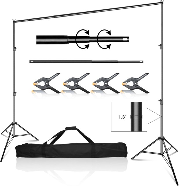 Der verstellbare Latour-Hintergrundständer bietet eine zuverlässige und vielseitige Einrichtung für all Ihre Bedürfnisse im Bereich Fotografie und Videografie. Der aus einer robusten Aluminiumlegierung gefertigte Ständer ist leicht und dennoch äußerst langlebig. Der Ständer kann in der Höhe von 70 cm bis 2,6 m und in der Breite bis zu 3 m verstellt werden und eignet sich für eine Vielzahl von Hintergründen für unterschiedliche Aufnahmeanforderungen. Das Stativ ist mit einem Schnellverschlusssystem ausgestattet, das einen mühelosen Auf- und Abbau ermöglicht und die Stabilität während des Einsatzes gewährleistet. Sein kompaktes und tragbares Design sowie die mitgelieferte Tragetasche erleichtern den Transport für Aufnahmen im Studio oder vor Ort. Ganz gleich, ob Sie professionelle Porträts, Live-Streams oder besondere Veranstaltungen aufnehmen möchten, der Latour Backdrop Support Stand ist eine effiziente und praktische Lösung.