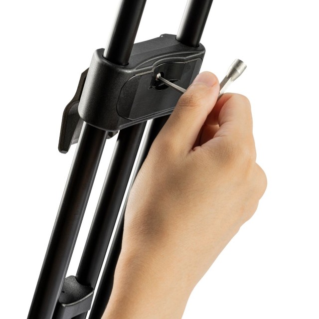 Wenn der Schnellverschluss gelöst wird, fahren die Beine ohne Widerstand aus, so dass das Stativ schnell und reibungslos aufgebaut werden kann. An drei Seiten des Stativfußes befinden sich Zubehöranschlüsse mit 1/4"- und 3/8"-Gewinde, an denen sich Zubehör wie Monitore und Leuchten bequem und sicher befestigen lassen. Aus Sicherheitsgründen sind die Stativbeine so konstruiert, dass sich der Benutzer beim beabsichtigten oder unbeabsichtigten Zusammenklappen des Stativs nicht die Finger einklemmen kann.